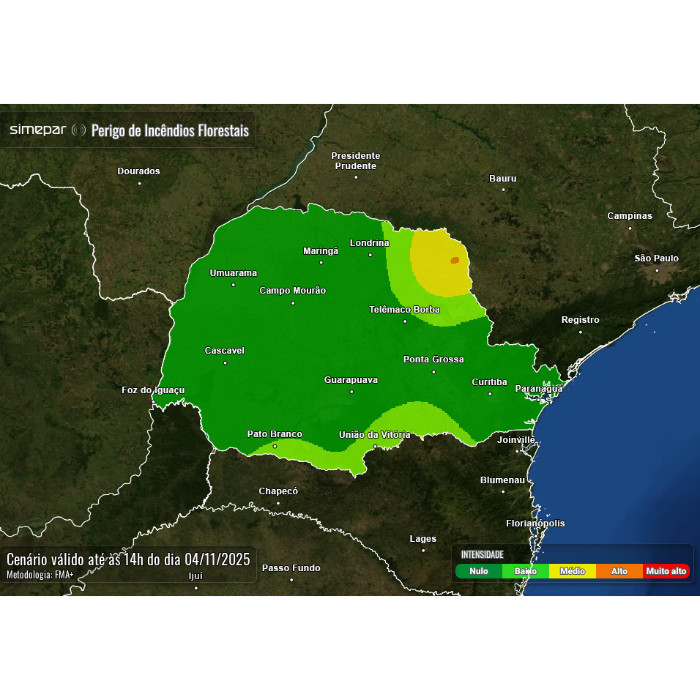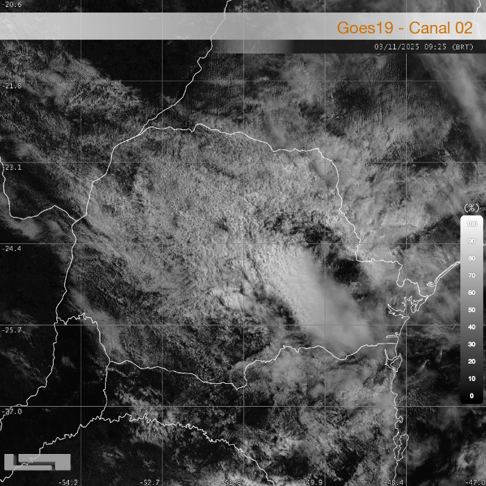 A segunda-feira inicia com grande nebulosidade e persistência das chuvas no Paraná. Os eventos não apresentam mais nível de severidade, mas as pancadas de chuva continuam ocorrendo nas regiões com maior desenvolvimento vertical das nuvens, como em Cândido de Abreu, Telêmaco Borba e Ivaí. Até o momento, os maiores acumulados de precipitação registrados atingiram 45,2 mm na estação de Cândido de Abreu e 39,6 mm em Ubiratã.