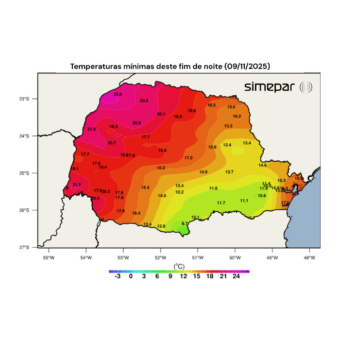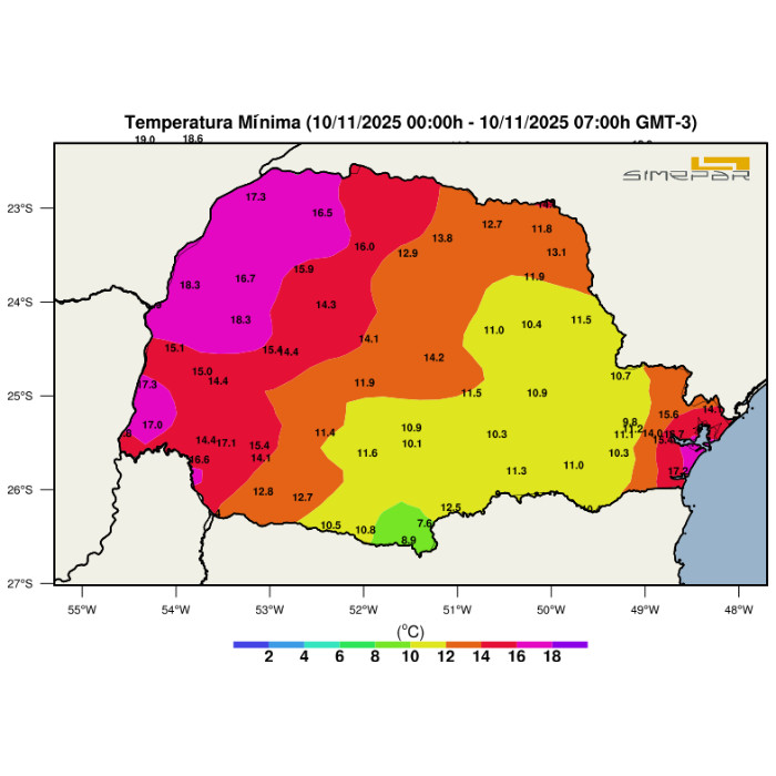 Neste final de noite, as menores temperaturas mínimas foram registradas nas regiões do Centro-Sul, Campos Gerais e RMC (representadas pelos tons de verde e amarelo na imagem a seguir), variando entre 8,0 e 15,0 °C. O menor valor até o momento foi registrado pelo termômetro de General Carneiro, com 8,7 °C, sendo esta a mínima do dia. Na faixa norte, há maior presença de nebulosidade alta, enquanto entre as praias, na RMC e em municípios do Sudeste Paranaense, próximos à divisa com Santa Catarina, observam-se nuvens baixas predominando.
