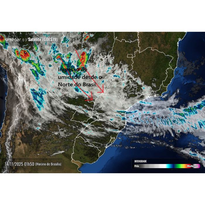 O estado do Paraná apresenta alta nebulosidade dispersa em todo o território. Ocorreram precipitações fracas, com predominância no norte do estado e em regiões pontuais do litoral. As temperaturas, com exceção da porção sul da região leste, permanecem acima dos 20 °C, contribuindo para sensação de abafamento. Até o momento, os acumulados registrados foram: Paranaguá 1,8 mm, Matinhos 2,6 mm, Cornélio Procópio 1,6 mm, Londrina 1,2 mm, Umuarama 1,4 mm, Altônia 3,6 mm, Guaíra 4,4 mm e Guaraqueçaba 2,8 mm.