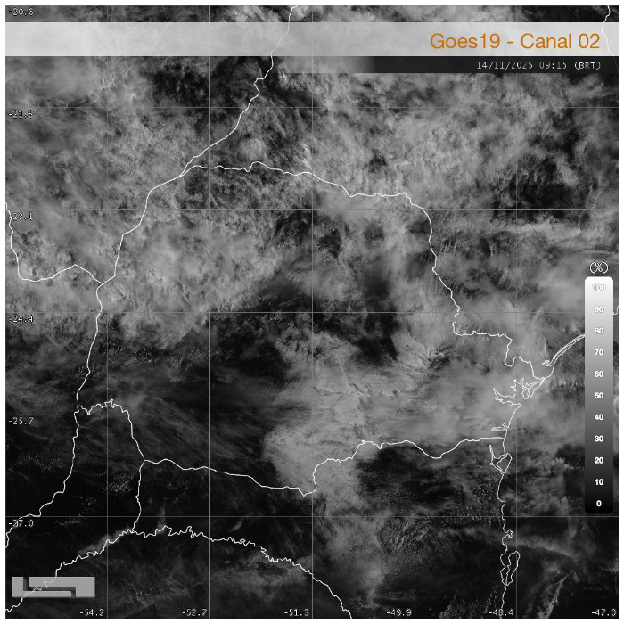 O Sol aparece tímido em alguns pontos do estado, como na capital, mas o destaque é para a variação de nuvens nas diversas regiões em uma atmosfera ainda muito instável. Neste momento ainda chove em alguns pontos do estado, com fraca intensidade (chuvisco/garoa) na faixa central e nos Campos Gerais, e uma chuva mais intensa no noroeste com trovoadas esparsas, mas sem temporal associado. Nas próximas horas o tempo segue instável, com aumento das instabilidades na metade sul do estado, onde se destacam as regiões do centro-sul ao litoral, com potencial para trovoadas, principalmente a partir do meio-dia.