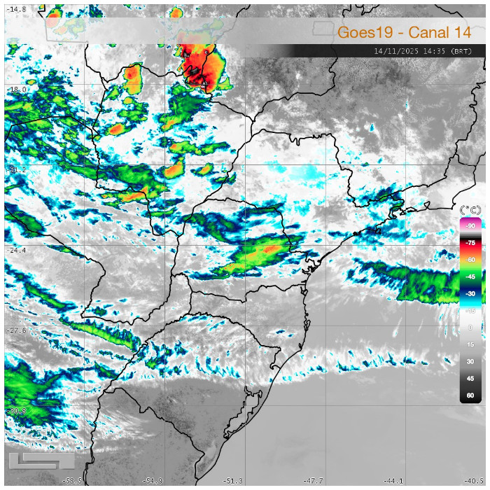A combinação do aumento das temperaturas com a maior disponibilidade de umidade favoreceu a formação de pancadas de chuva isoladas, com maior concentração na região Centro-Sul e nos Campos Gerais. Destacam-se áreas em tonalidade avermelhada, que indicam maior desenvolvimento vertical das nuvens, condição associada a maior incidência de raios e precipitações de forte intensidade.