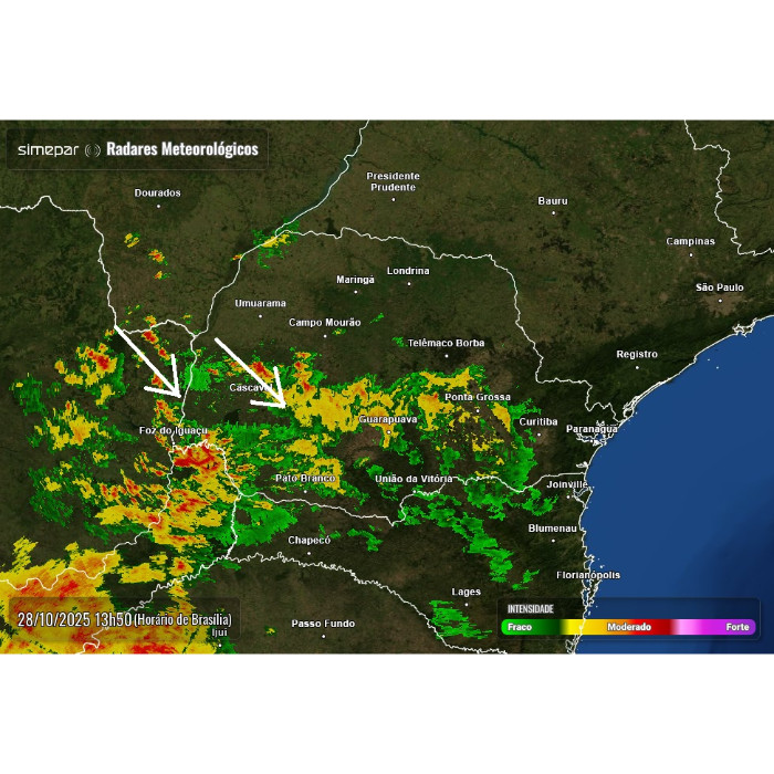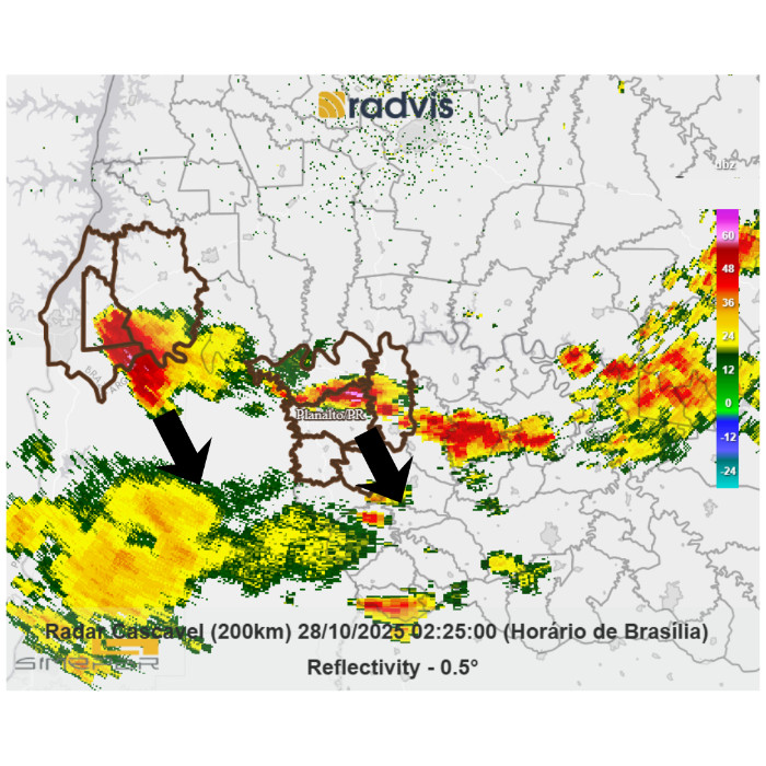Entre as regiões Oeste e Sudoeste, como demonstrado na imagem a seguir, extraída do radar meteorológico do Simepar, ocorreram temporais localizados, com alta frequência na incidência de raios, nas proximidades do sul de Foz do Iguaçu, Capanema, Realeza, Planalto e municípios vizinhos.À medida que essas áreas de convecção se deslocavam na direção das setas pretas, sua intensidade foi gradualmente diminuindo. Não houve registros de fortes rajadas de vento nem de acumulados de chuva significativos decorrentes destes temporais.