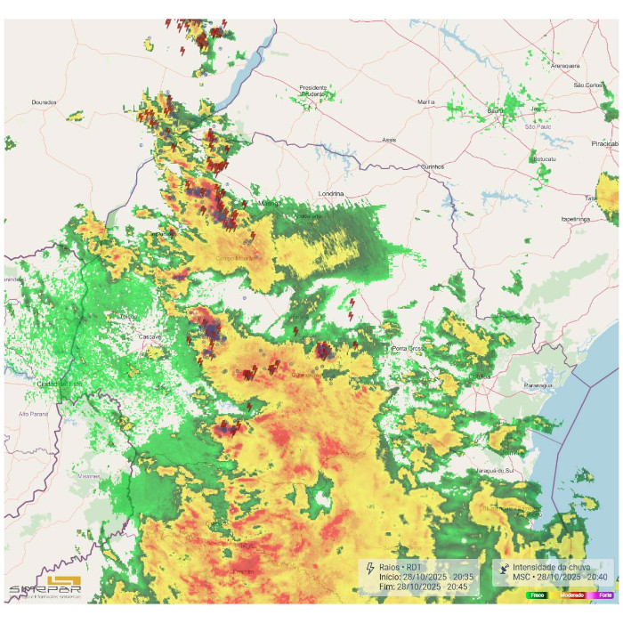 Noite de tempo instável no Paraná. Ainda chove forte, com muitos raios, entre o noroeste, parte do oeste e o centro do estado. No entanto, nas demais regiões paranaenses também segue com chuva de intensidade entre fraca e moderada. Nas próximas horas a chuva ganha intensidade ente o Vale do Ivaí, Norte Novo, Norte e os Campos Gerais. Entre a capital e as praias continua, predominantemente, com chuva leve.