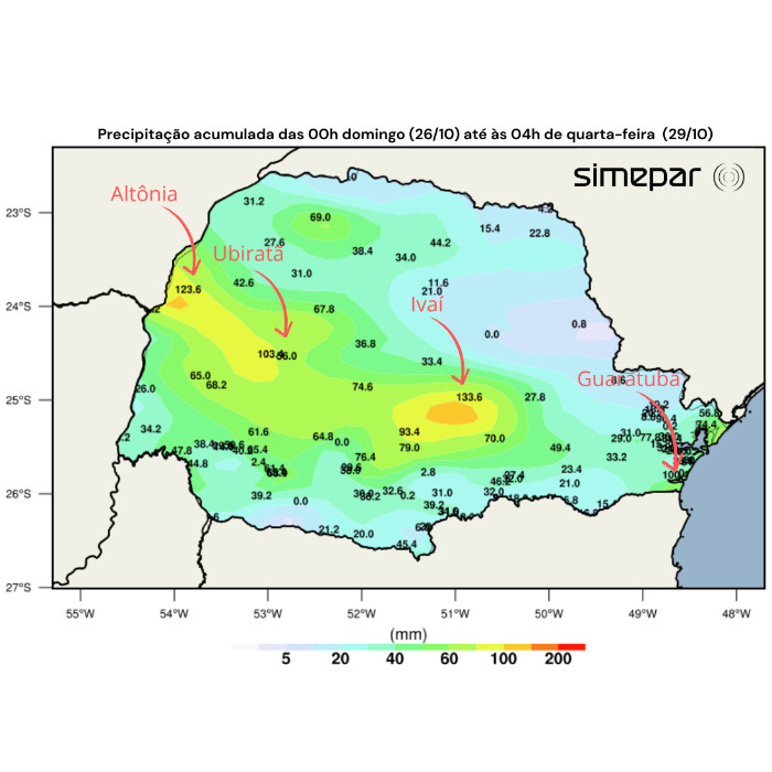 Desde o início desta semana, algumas estações meteorológicas registraram acumulados de chuva superiores a 100 mm, como é o caso das situadas nos municípios de Altônia, Ivaí, Ubiratã e Guaratuba, conforme destacado na imagem a seguir.