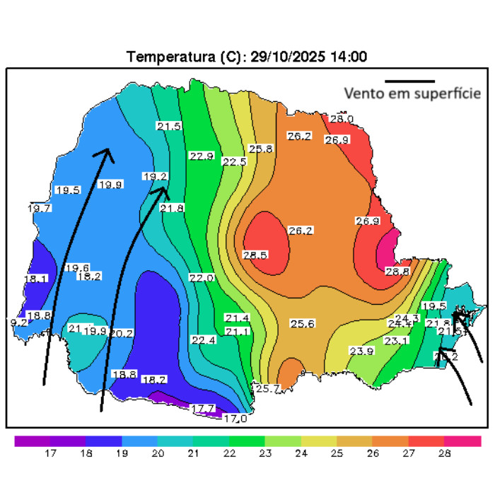 A tarde desta quarta-feira segue com pouca precipitação no estado. Chuvas bem isoladas ocorrem nos Campos Gerais e na RMC (especialmente próximo a serras). No Litoral o céu está encoberto, com chuviscos ocasionais. No Sudoeste, Oeste e no Noroeste muitas nuvens, com vento predominante do quadrante sul. Temperaturas, na última hora, superaram os 28°C nas estações meteorológicas de Cândido de Abreu, Cambará e Cerro Azul. No Note pioneiro o risco de incêndios florestais segue mais elevado.