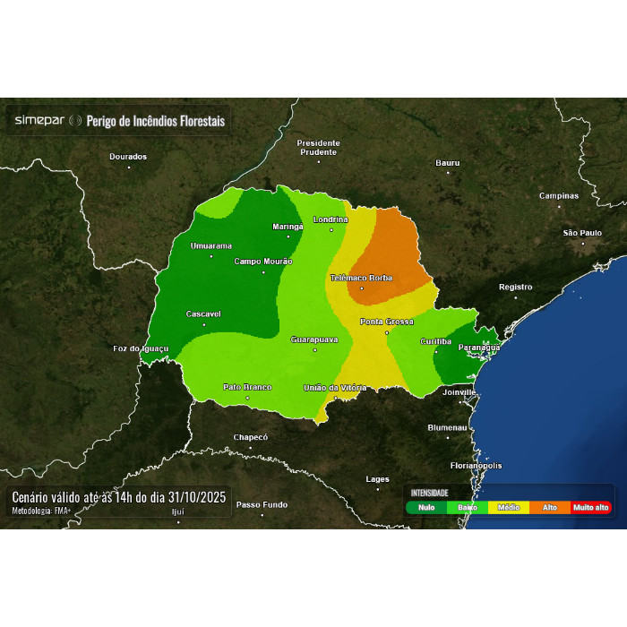 Além da imagem de satélite, segue em anexo o mapa com o risco para incêndios florestais válido até às 14h desta sexta-feira no Paraná.