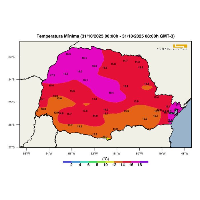 Muitas nuvens permanecem sobre o Paraná nesta manhã, com registros de chuva leve e pontual, especialmente entre os setores leste e nordeste do estado. Na imagem ao lado, observam-se os dados de temperatura mínima desta sexta-feira nas diversas regiões paranaenses, evidenciando a diferença térmica entre as áreas. No noroeste, as mínimas ficaram próximas de 18 °C, enquanto no extremo sul do estado os valores ficaram ao redor de 10 °C, caracterizando um amanhecer um pouco mais frio nessa região.