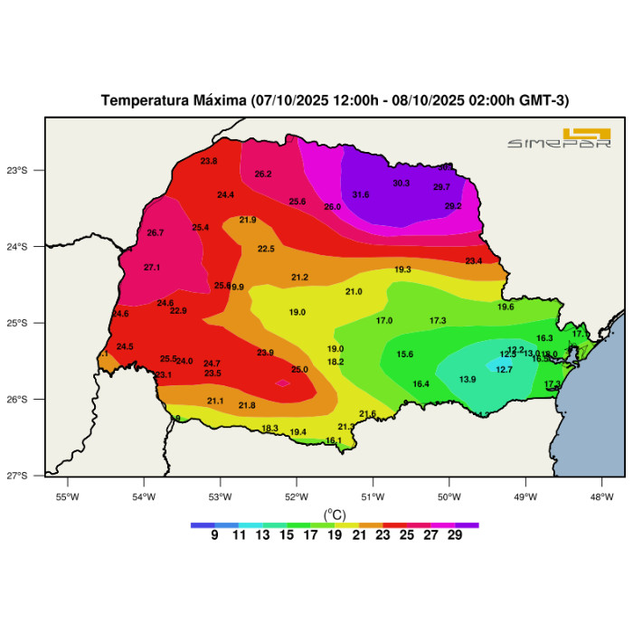 Nesta quarta-feira, apenas na faixa norte do Paraná as temperaturas máximas ultrapassaram os 20,0 °C — condição que pode ser observada na imagem a seguir. Em Paranavaí, por exemplo, foi registrada a maior temperatura do dia, com 26,8 °C. Nas demais regiões do estado, as máximas permaneceram abaixo deste valor. Entre os Campos Gerais e a RMC, os termômetros não passaram dos 16,0 °C.