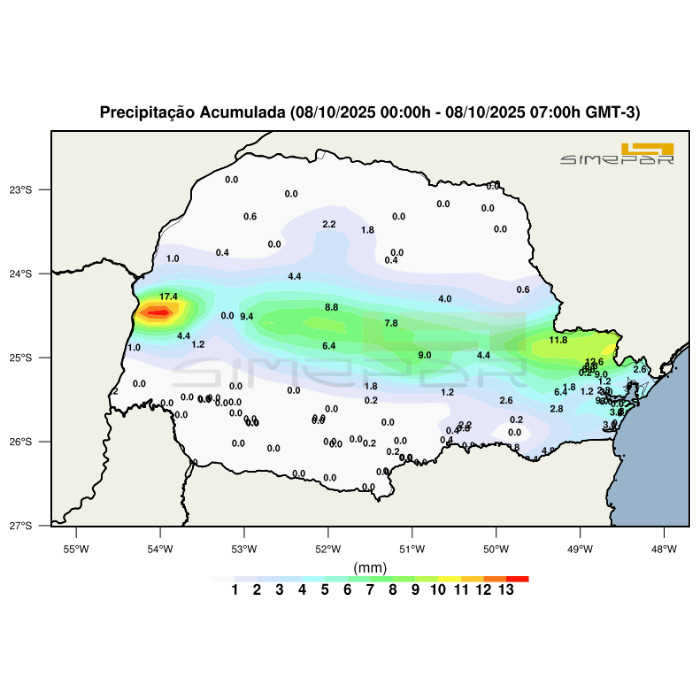 Ao longo da madrugada e neste início de manhã, foram registradas chuvas de intensidades fracas a moderadas e em alguns momentos acompanhadas de algumas descargas elétricas na faixa central do estado, desde o oeste até o leste. O amanhecer foi frio nas regiões Sul, Campos Gerais e RMC, onde os termômetros ficaram abaixo dos 10 ºC, com destaque para Palmas que registrou 6,6 ºC. O mapa mostra os acumulados de chuva registrados pelas redes de estações meteorológicas do Simepar e Inmet, até 07h.