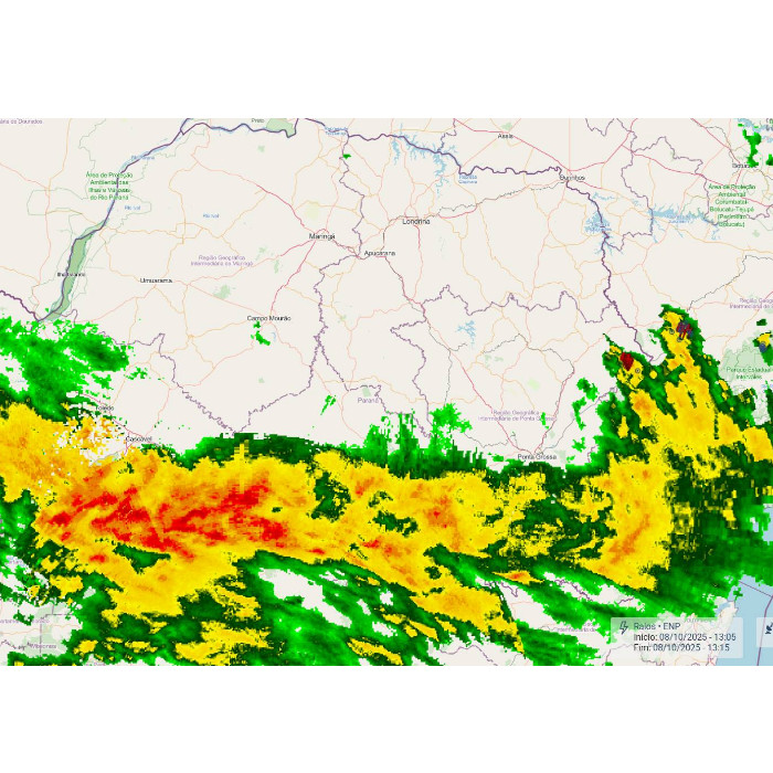 A nebulosidade ainda permanece bastante presente sobre o Paraná, com ocorrência de garoa ou chuva fraca principalmente entre os Campos Gerais, Sudeste e o Leste do estado. Nesta noite, no estado de São Paulo, há registro de pancadas de chuva isoladas, com núcleos variando entre intensidade moderada e forte, além da presença de descargas atmosféricas. A imagem a seguir, extraída dos radares meteorológicos, evidencia essas áreas de instabilidade. Na região do Norte Pioneiro (destacada pelas setas vermelhas), há registros de rajadas de vento variando entre 55 km/h e 60 km/h. Além disso, até às 22h30, as menores temperaturas foram registradas na metade sul do território paranaense, com valores entre 10 °C e 12 °C. Em contraste, a maior temperatura foi observada na região Noroeste, com cerca de 23 °C.