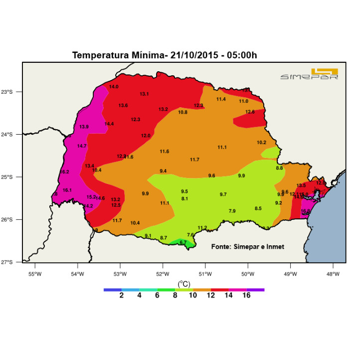 Durante a madruga, foram registrados chuviscos ocasionais entre a RMC e o litoral. Mas o destaque desta madrugada fica por conta das temperaturas baixas, principalmente nas regiões centro-sul, sul, Campos Gerais e RMC, onde os termômetros registram temperaturas abaixo dos 10 ºC, com destaque até o momento para Palmas que registra 6,7 ºC. O mapa mostra as temperaturas mínimas até às 5h.