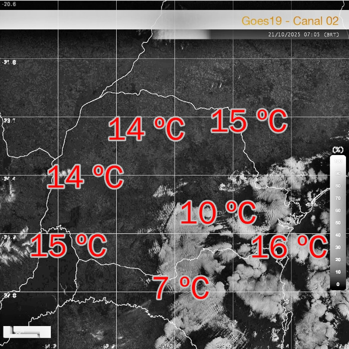 O sol predomina na maior parte do Paraná, embora haja alguma nebulosidade no leste do Estado, mas sem registro de chuvas. Em relação às temperaturas, o frio nas últimas horas foi mais significativo nas áreas ao sul do Paraná, com valores ligeiramente abaixo de 7 ºC. No mapa ao lado, estão representadas as temperaturas registradas na última hora, e não os menores valores do dia.