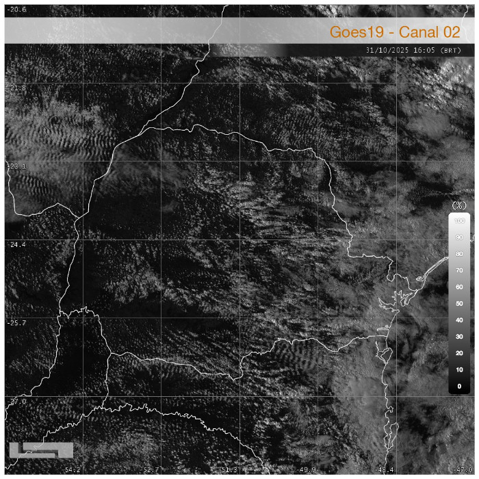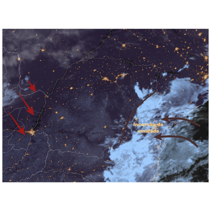 A circulação marítima ainda mantém intrusão de ar frio e úmido do oceano em direção ao continente, pela faixa leste, o que favorece a formação de nuvens até os Campos Gerais. Entre a Serra do Mar e o litoral, segue o potencial para chuviscos ocasionais e passageiros nas próximas horas. Com relação às temperaturas, valores mais baixos são registrados da RMC e Campos Gerais até o sudoeste, variando entre 13 e 17 °C nos termômetros. Em contraste, no noroeste e norte central, os valores mínimos desta noite se encontram mais elevados, com até 22,8 °C em Altônia. Na imagem de satélite a seguir, além das nuvens baixas no leste do Paraná, é possível observar o avanço de uma banda de nebulosidade da região do Paraguai em direção ao oeste do estado, o que deve trazer pancadas de chuva nas próximas horas.