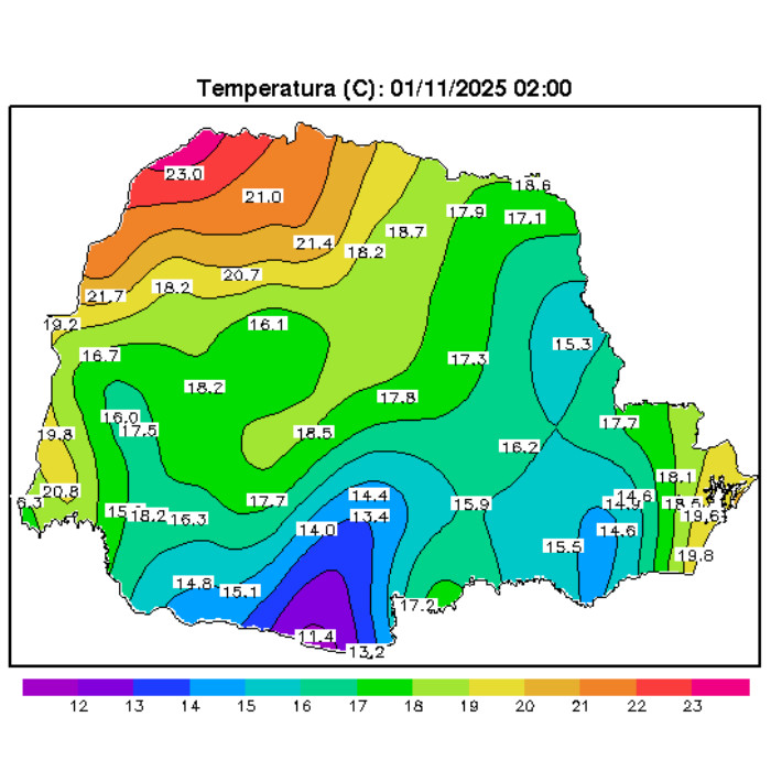 O tempo permanece instável no Paraná, especialmente entre porções do oeste/sudoeste até o centro/sul e norte, com ocorrência de chuvas isoladas. No momento, essas precipitações são pontuais, mas há tendência de que as áreas de instabilidade se intensifiquem e se aglomerem mais ao longo da manhã e da tarde, favorecendo uma condição de maior abrangência das chuvas. Temperaturas em média, com 21 °C a noroeste, região mais aquecida, e 14 °C a sudoeste, setor com valores mais baixos do Estado, no momento.