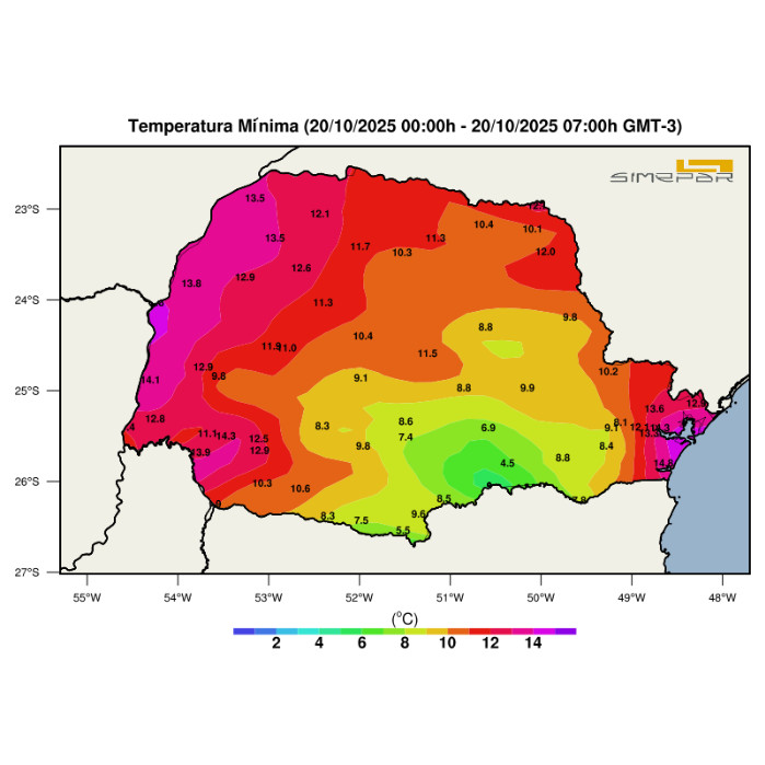 Maior presença de nuvens em parte do leste do Paraná. Há ocorrência de chuviscos entre a Serra do Mar e o Litoral, onde é mais intensa a formação de nebulosidade baixa. As temperaturas se destacam no sudeste do Estado pelos valores menores, com São Mateus do Sul registrando 4,5 °C às 6 horas da manhã.