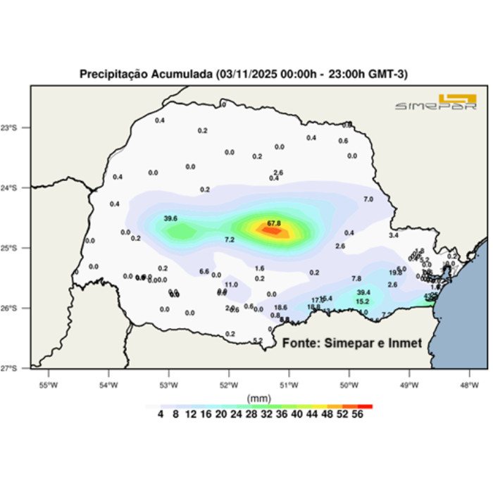 A segunda-feira inicia com grande nebulosidade e persistência das chuvas no Paraná. Os eventos não apresentam mais nível de severidade, mas as pancadas de chuva continuam ocorrendo nas regiões com maior desenvolvimento vertical das nuvens, como em Cândido de Abreu, Telêmaco Borba e Ivaí. Até o momento, os maiores acumulados de precipitação registrados atingiram 45,2 mm na estação de Cândido de Abreu e 39,6 mm em Ubiratã.